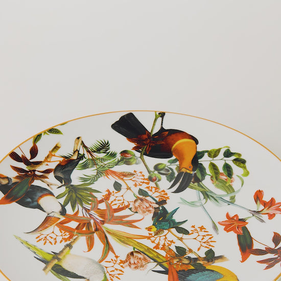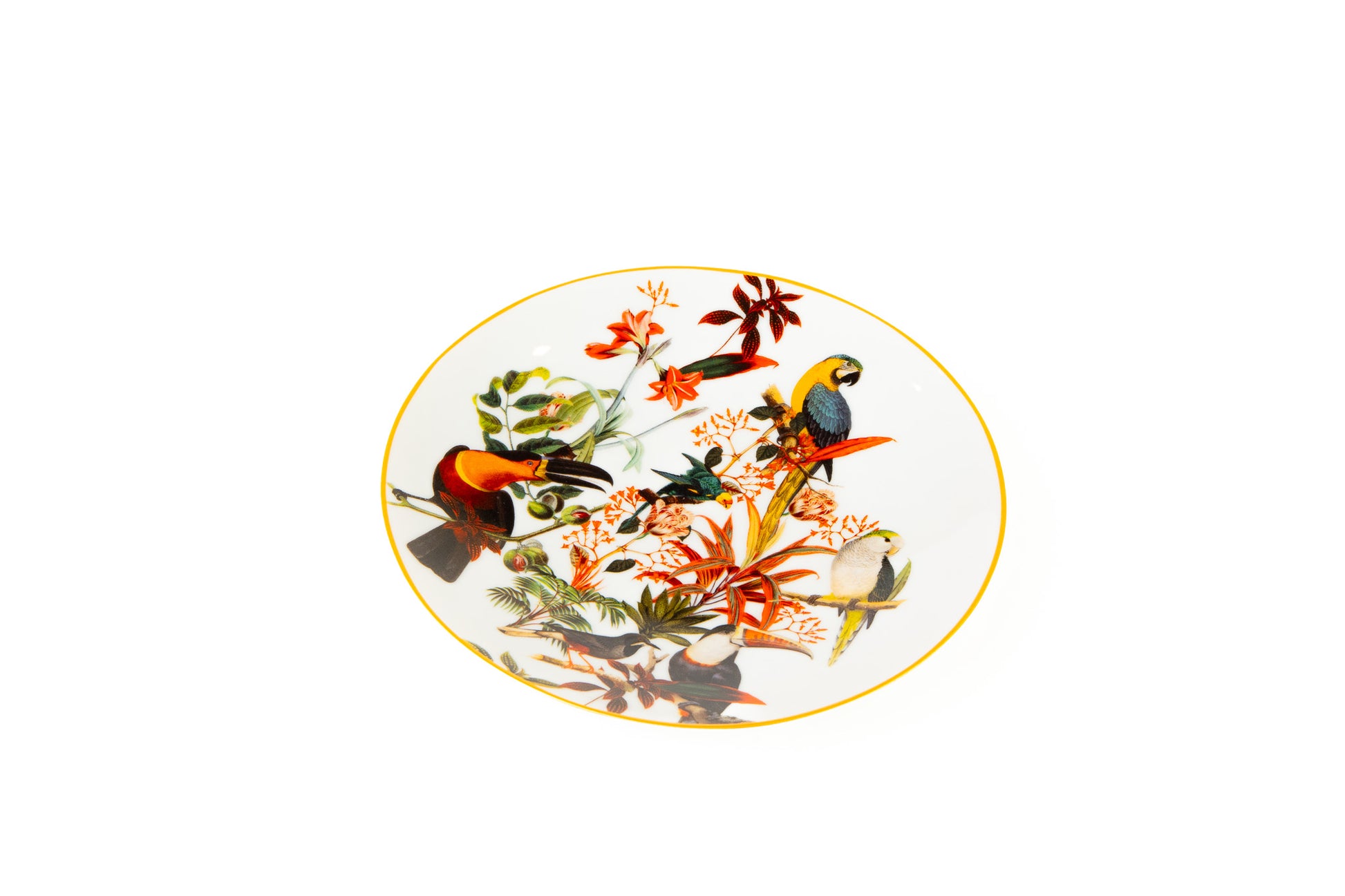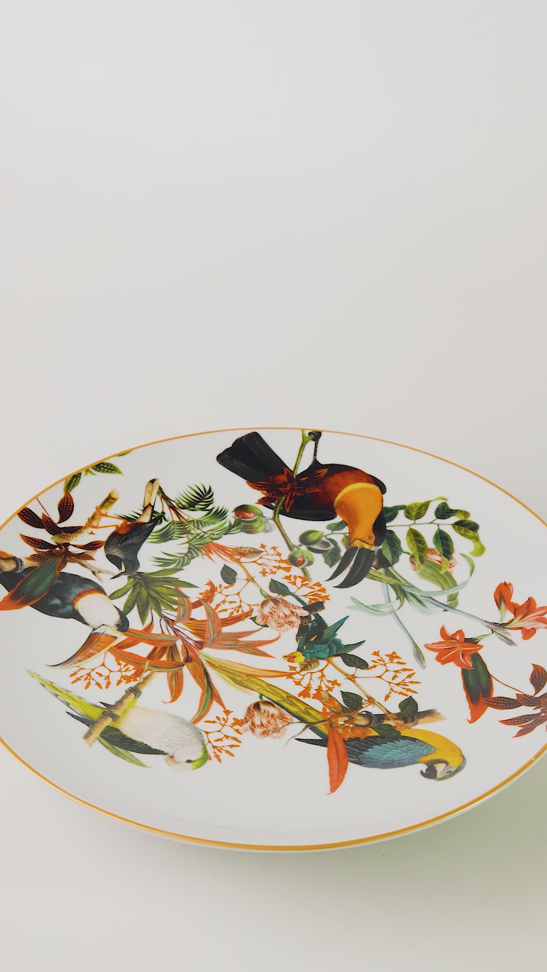 A coleção Brasil lustrado mergulha na riqueza da fauna e flora brasileira - araras, bromélias, folhagens e cores que dançam em porcelana como uma aquarela viva.