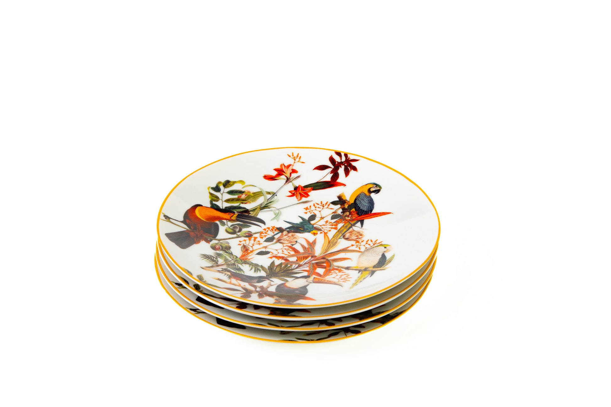 A coleção Brasil lustrado mergulha na riqueza da fauna e flora brasileira - araras, bromélias, folhagens e cores que dançam em porcelana como uma aquarela viva.